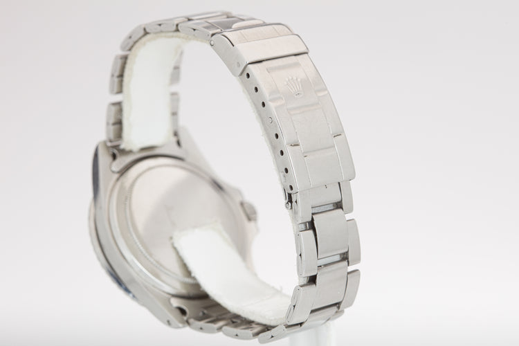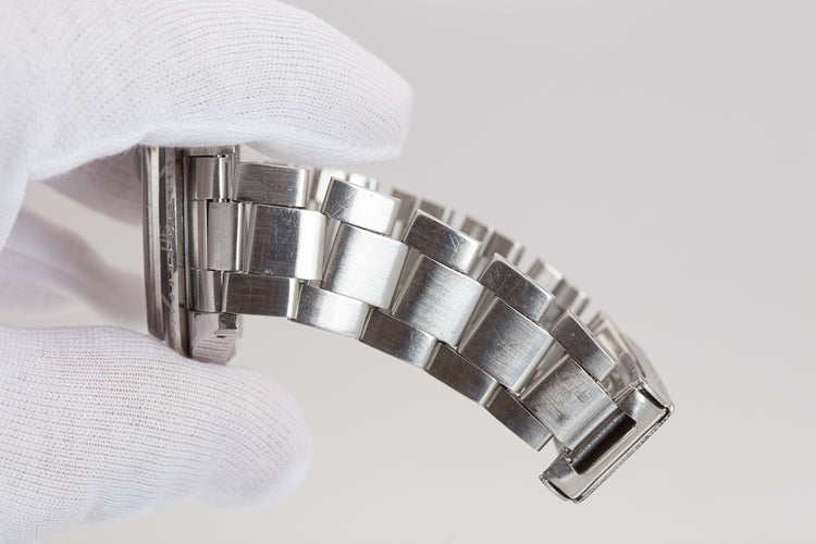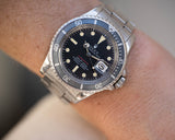 Excellent case that has previously been polished and shows light wear from use. The case retains the original factory bevels. The black bezel insert has faded to a light blue-grey hue. Excellent 9315 folded link oyster bracelet with 11 links, dive extension, and 280 end links.
