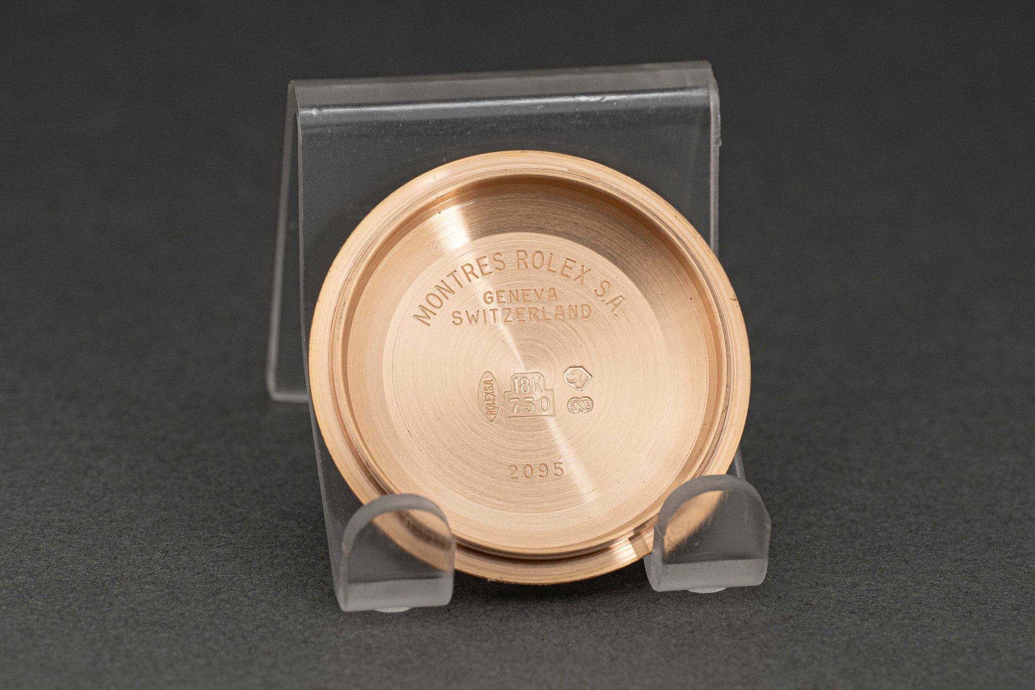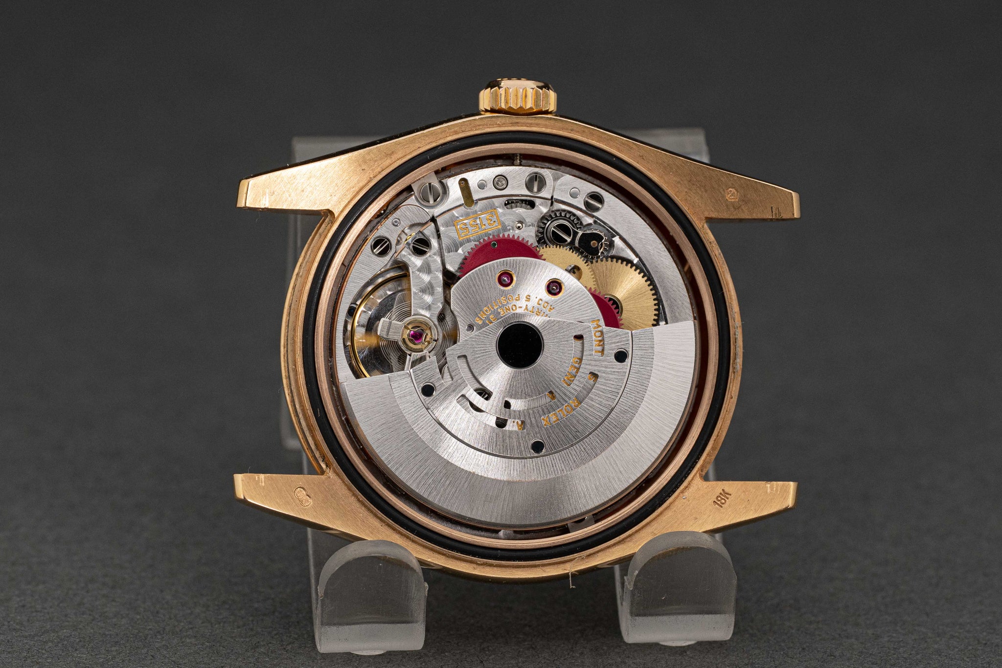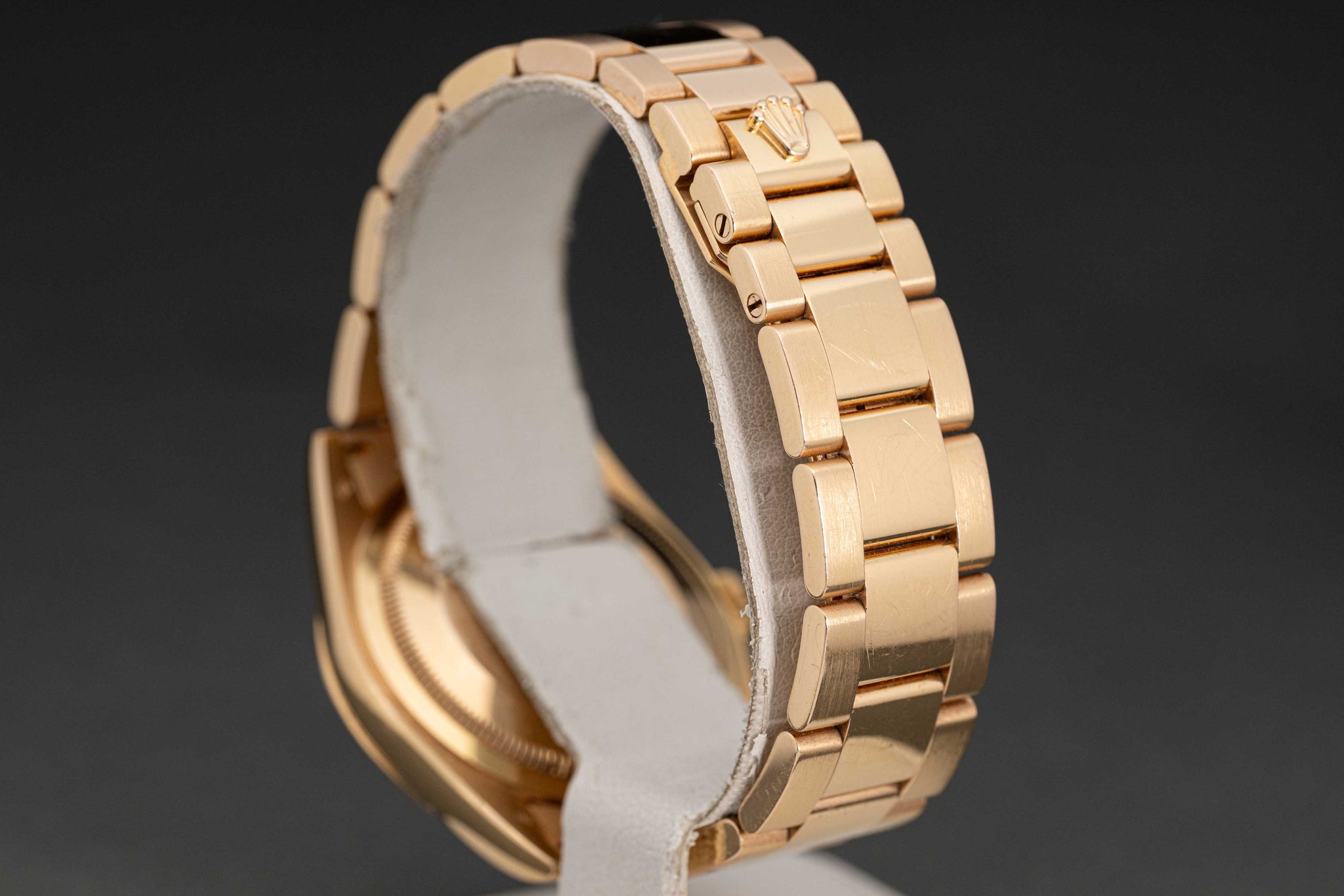 Excellent 18k YG case which shows light wear from use. Excellent 18k YG Oyster bracelet with 12 links, two half links, 73855 bracelet code, and hidden clasp. Bracelet shows wear from use.